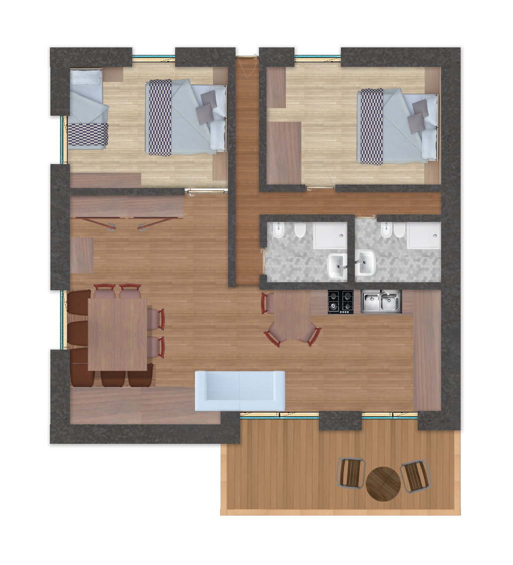 Questo appartamento, di 50 metri quadrati, si trova al pianoterra e può ospitare da 2 a 5 persone. È composto da 2 camere da letto, una matrimoniale e una con letto doppio e letto aggiuntivo, salone con tv e angolo cottura attrezzato. Il bagno è dotato di wc, doccia e bidet. L'alloggio comprende inoltre un ampio terrazzo.